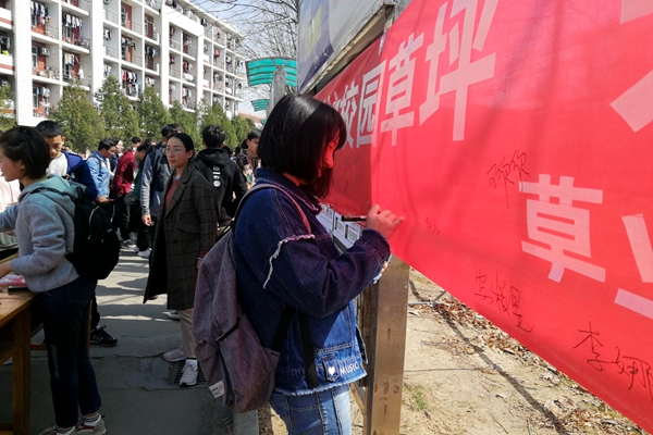 活动前期,久久热 学生会成员紧张策划,积极动员,久久热 学子响应热烈,为活动的顺利开展打下了坚实的基础。3月11日中午,久久热 学生会在北校区西区雕塑张挂以保护草坪为主题的横幅并邀请久久热 学子签名明志。活动期间,由学生会成员结合久久热专业知识进行宣讲,主要为在场人员讲解草坪建植和维护的不易以及被踩过的草坪很难恢复的现状,以此来号召大家不要因为节省时间或缩短路程而随意践踏草坪,宣讲过程中,有不少同学深受感触,前来填写有关校园草坪现状及维护情况的调查问卷,并自愿在横幅上签名以示保护校园草坪之志。