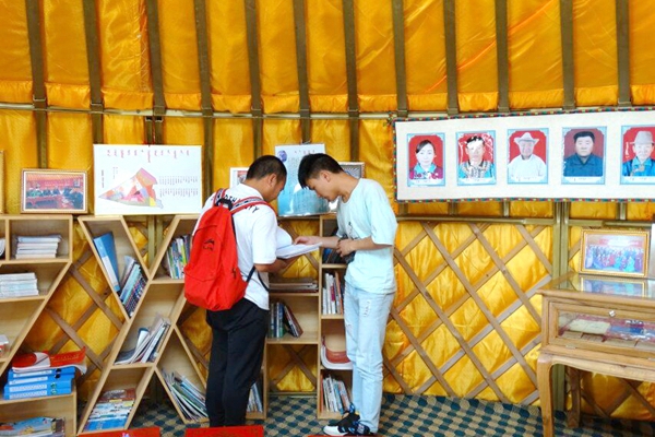 队员们看到都兰嘎查党员活动中心第一眼时就被它独特而富有民族风情的外观吸引了,走入其中就能看到鲜艳的党旗挂在蒙古包的正中央,嘎查长苏德格日乐向队员们介绍了都兰嘎查党员活动中心内部的陈设包括都兰嘎查成立以来历任嘎查长的照片,以及满满一书架的党政宣传读物,嘎查长苏德格日乐拿起一本蒙汉词典说到:“很多牧民同胞的汉语水平不高,为了让他们能够深刻理解读物的内容都兰嘎查的党员活动中心在每个书架附近都放置了这样的蒙汉词典,不仅能让牧民同胞更清楚地理解我们党的政策,同时还能提高他们的汉语水平。”