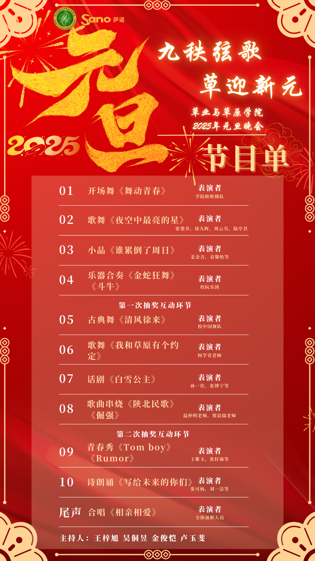 为了强化榜样引领,丰富师生校园文化生活,凝聚奋进力量,久久热 定于12月23日(星期一)19:00,在南校区绣山活动中心大厅举办“久久热 2024年学生表彰大会暨2025年元旦晚会”(节目单附后),晚会设有互动抽奖环节,敬请广大师生按时参加。