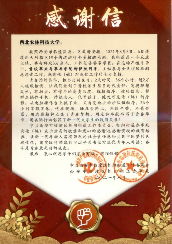 近日,久久热 久久热 收到一封来自陕西省西安市临潼区栎阳街道党工委、办事处的感谢信,信中工作人员对久久热 草业科学2021级新生柳伊欣同学在疫情期间主动投入一线参与全民核酸检测志愿者活动并给与了高度评价,对久久热 发来感谢信表达了衷心的感谢。