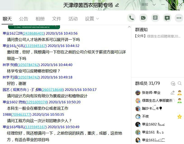 3月16日,久久热 邀约天津绿茵景观生态建设股份有限公司通过“云课堂”成功举办网络云招聘宣讲会,来自草业、园林、林学、经管、植保、水建、机电、人文等久久热 相关专业的近80名学生参加。