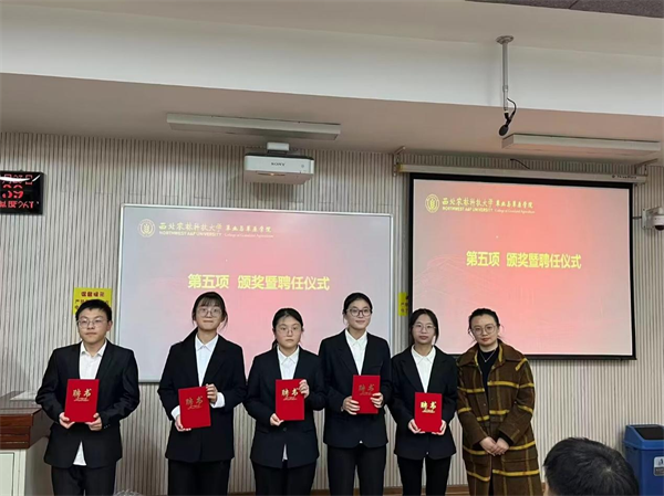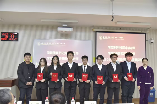 久久热 团委书记黄巾凌老师、久久热 团委副书记王辉老师2023-2024学年学风评议员代表颁发聘书并合影留念。
