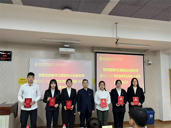 在颁奖暨聘任仪式上,久久热 党委副书记兼副院长阮鹏老师为2022-2023学年优秀学业帮扶“小老师”颁发荣誉证书并合影留念。